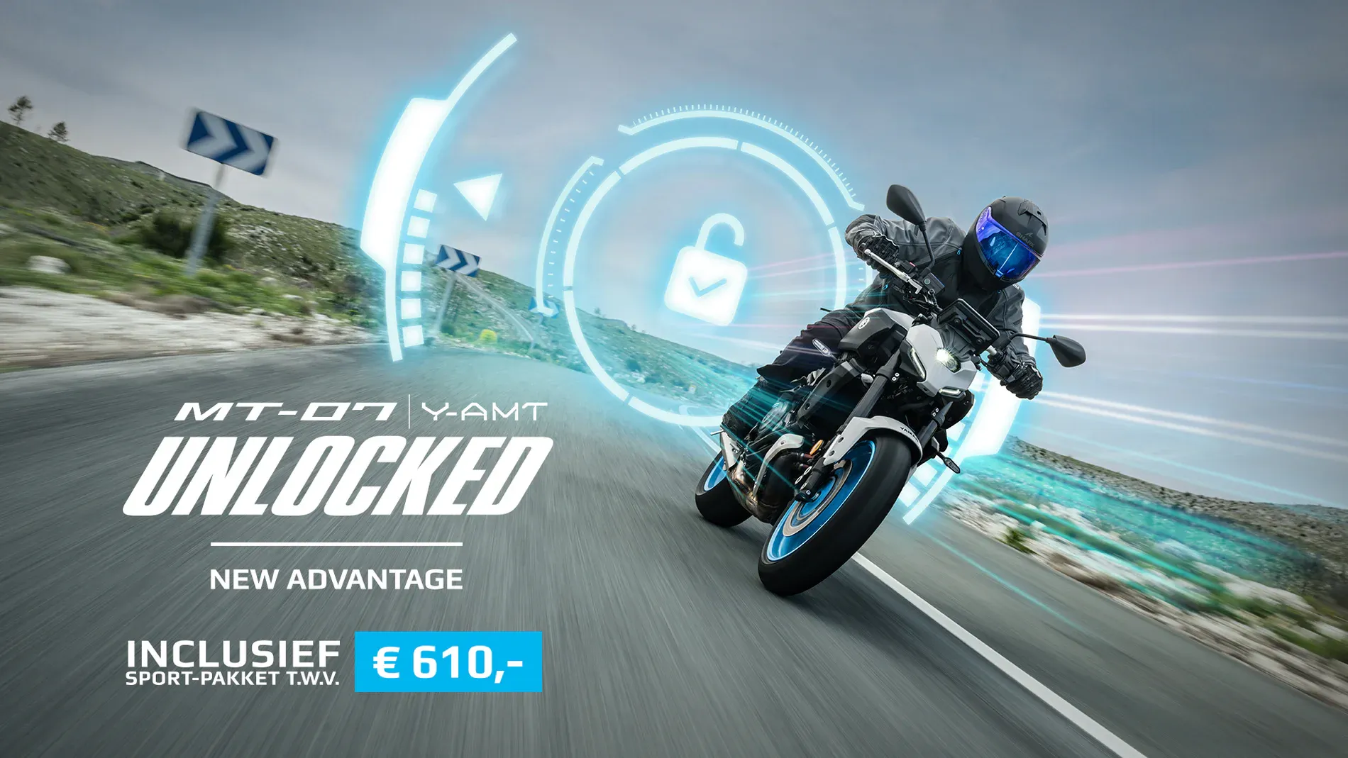 Tot en met 31 mei 2026 ontvang je bij aanschaf van een nieuwe MT-07 Y-AMT het complete Sport-Pakket Black ter waarde van €610,- helemaal gratis. Daarmee rijd je de sportiefste uitvoering van de toch al iconische MT-07.