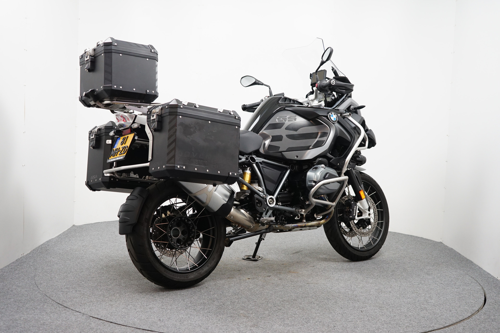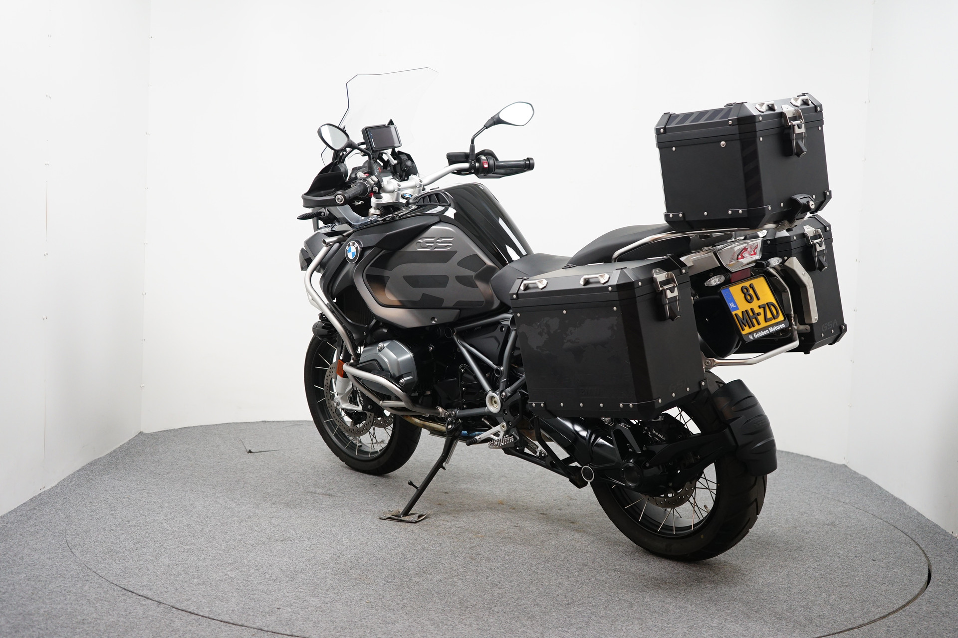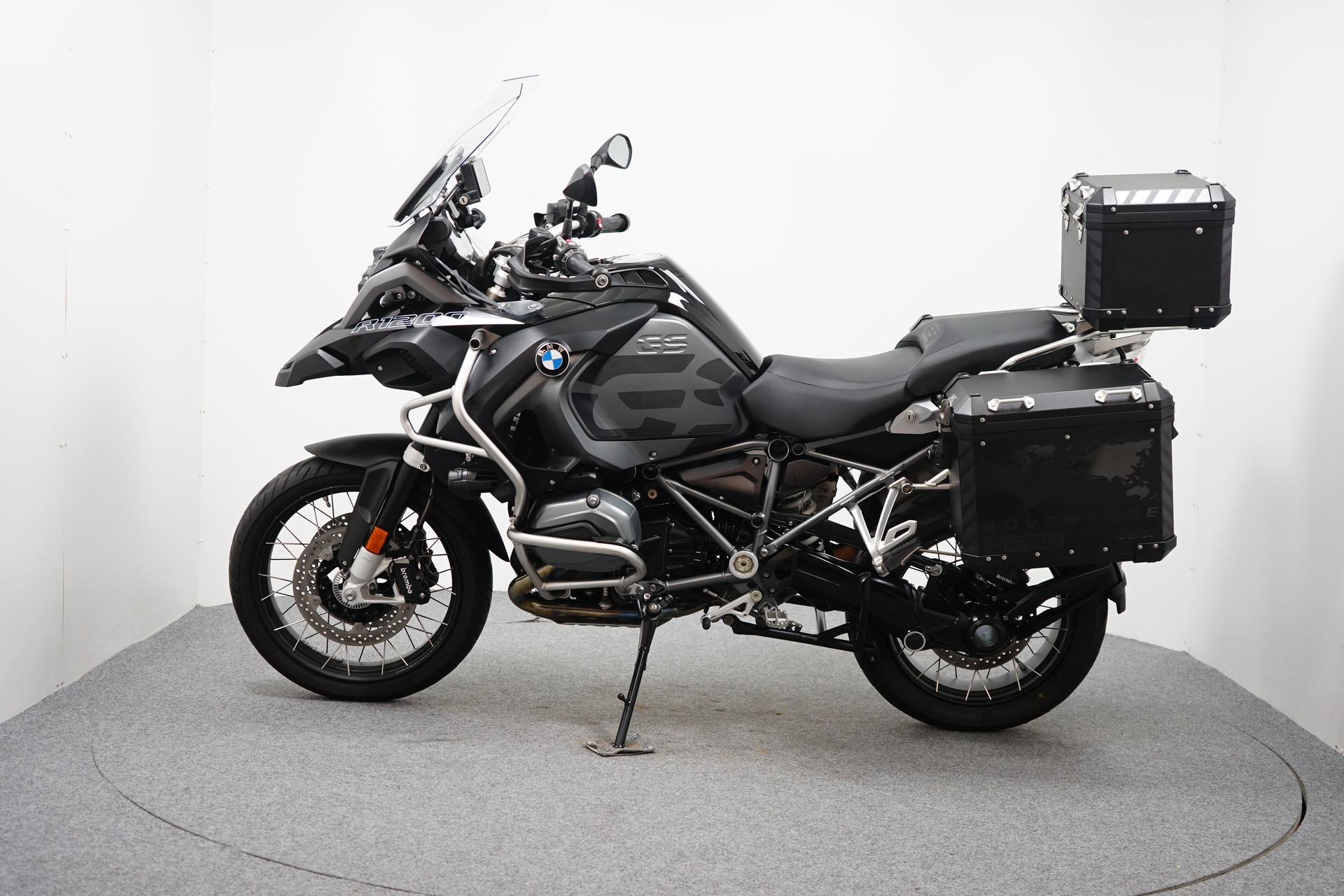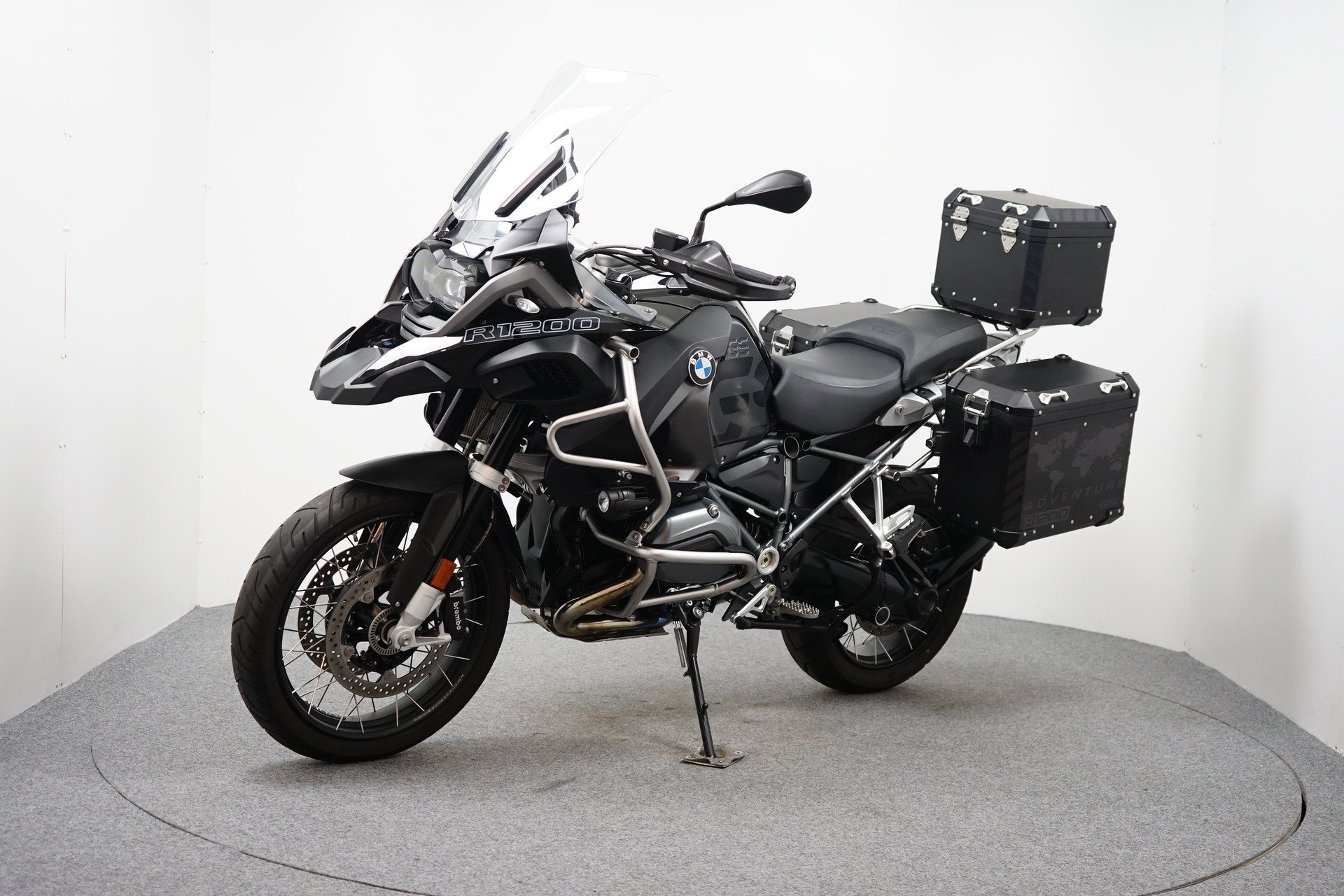Een in prachtstaat verkerende BMW R 1250 GS ADVENTURE Triple Black ABS met 3-delige kofferset, ABS, Middenbok, Valbeugels, Mistlampen, ESA, Handvatverwarming, Cruise Control, Rij-modi, Navigatiesysteem BMW en Handkappen.