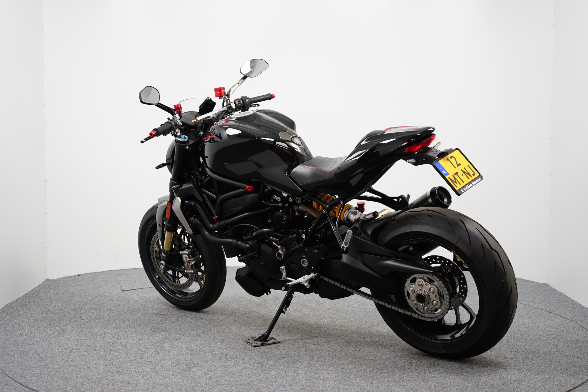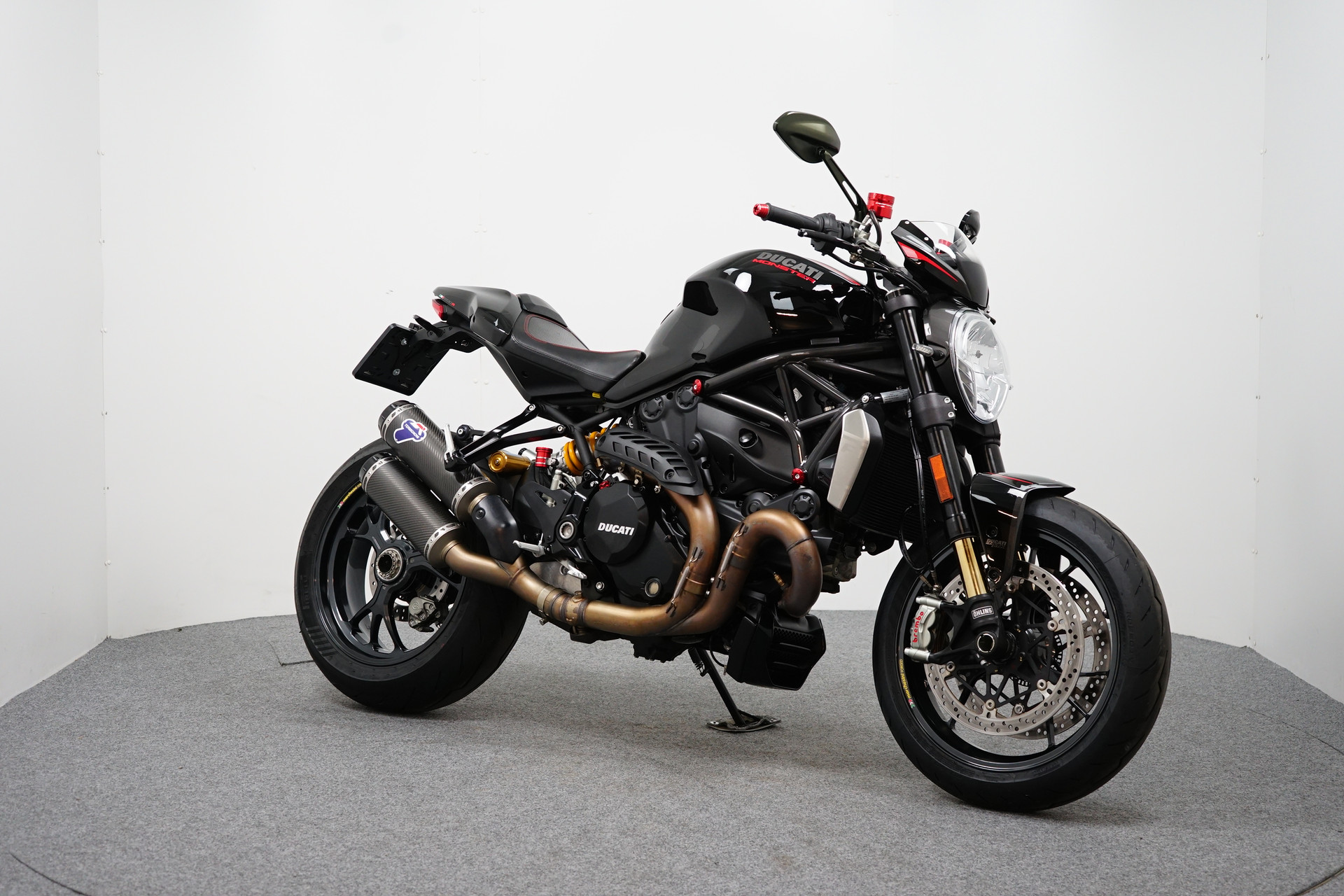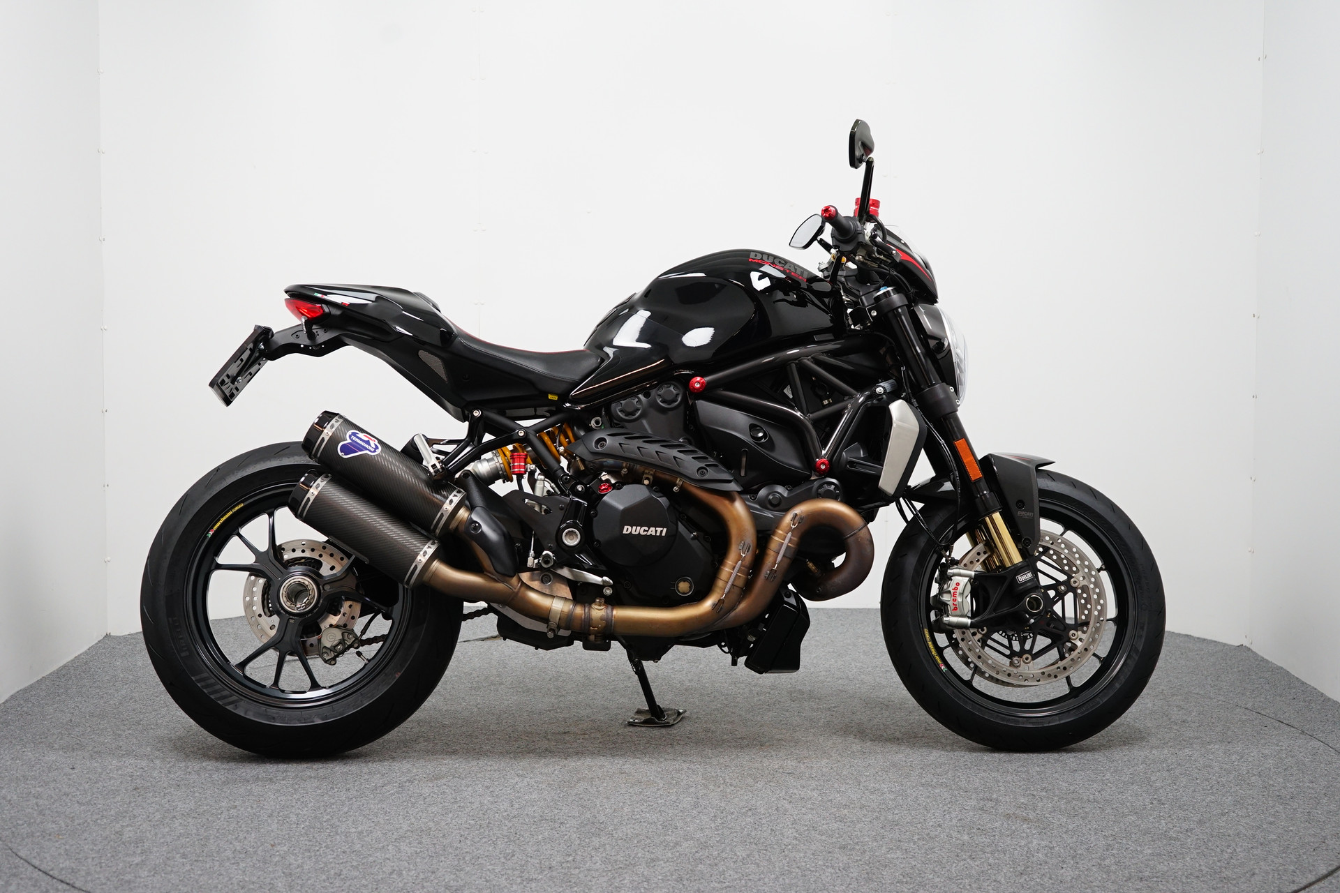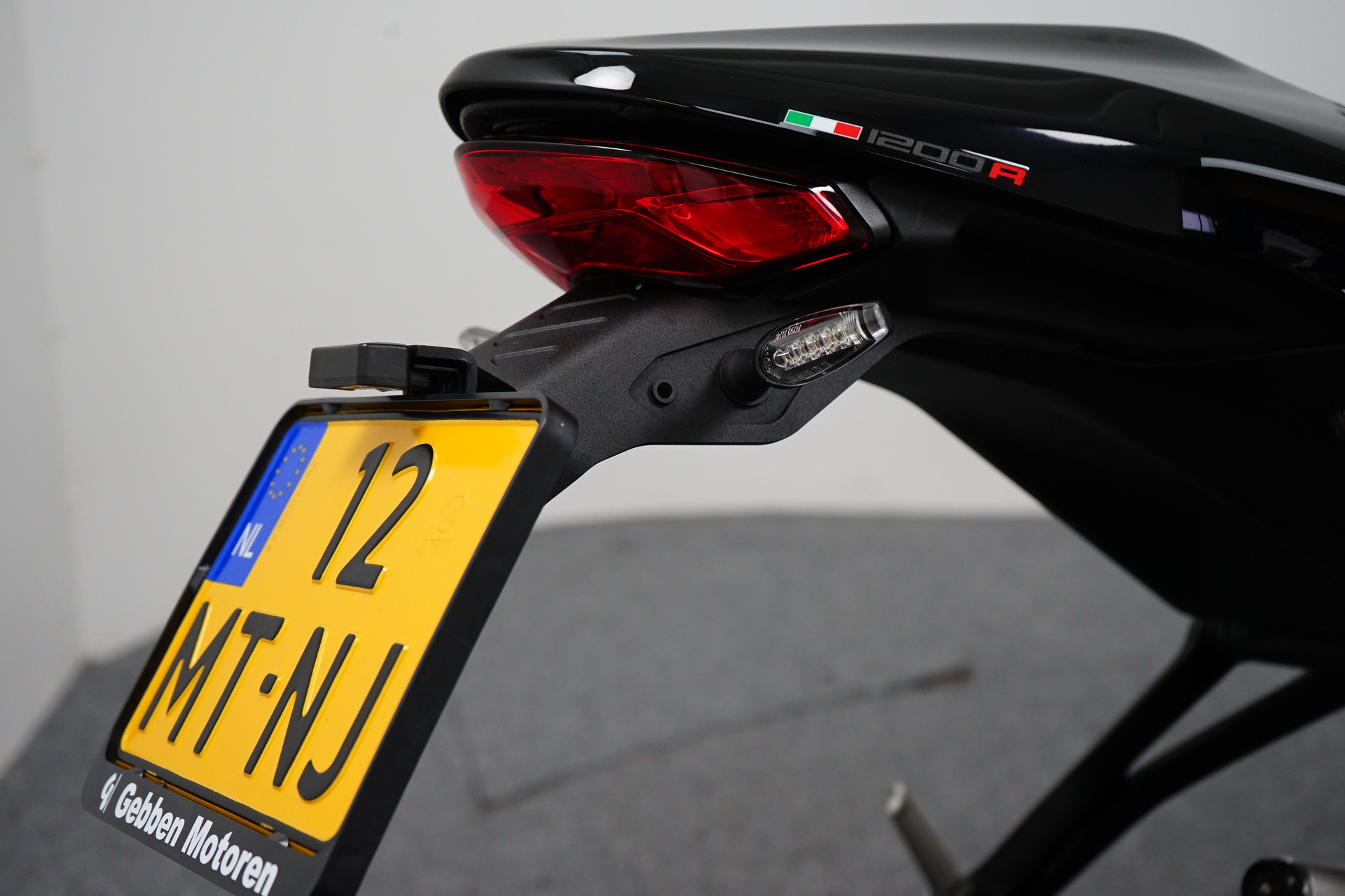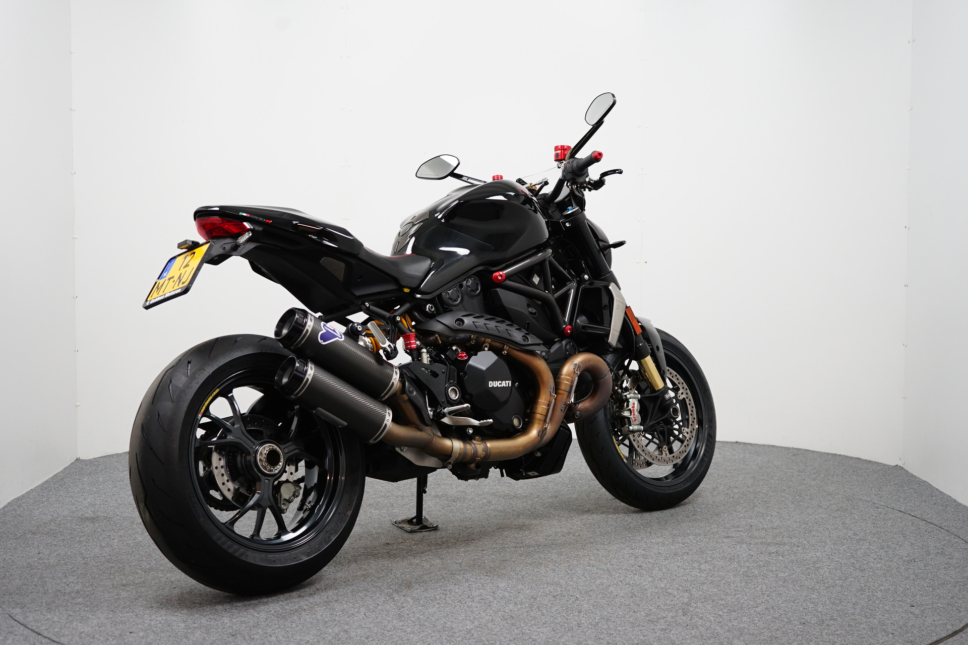 Een in prachtstaat verkerende Ducati Monster 1200 R met Termignoni uitlaatsysteem, Seat Cover, Tankpad, Korte kentekenplaathouder, Led knipperlichten en Stuurdemper.