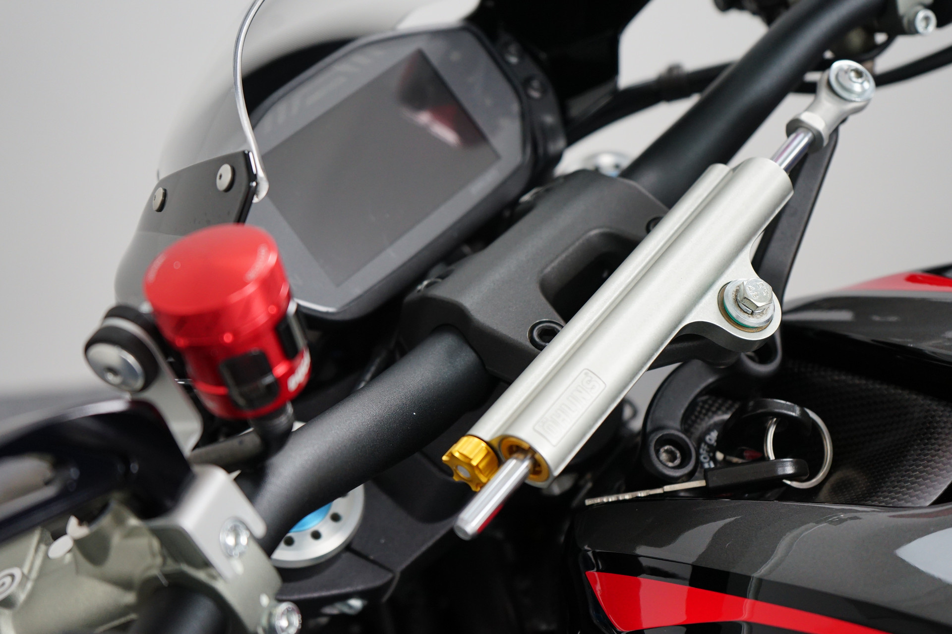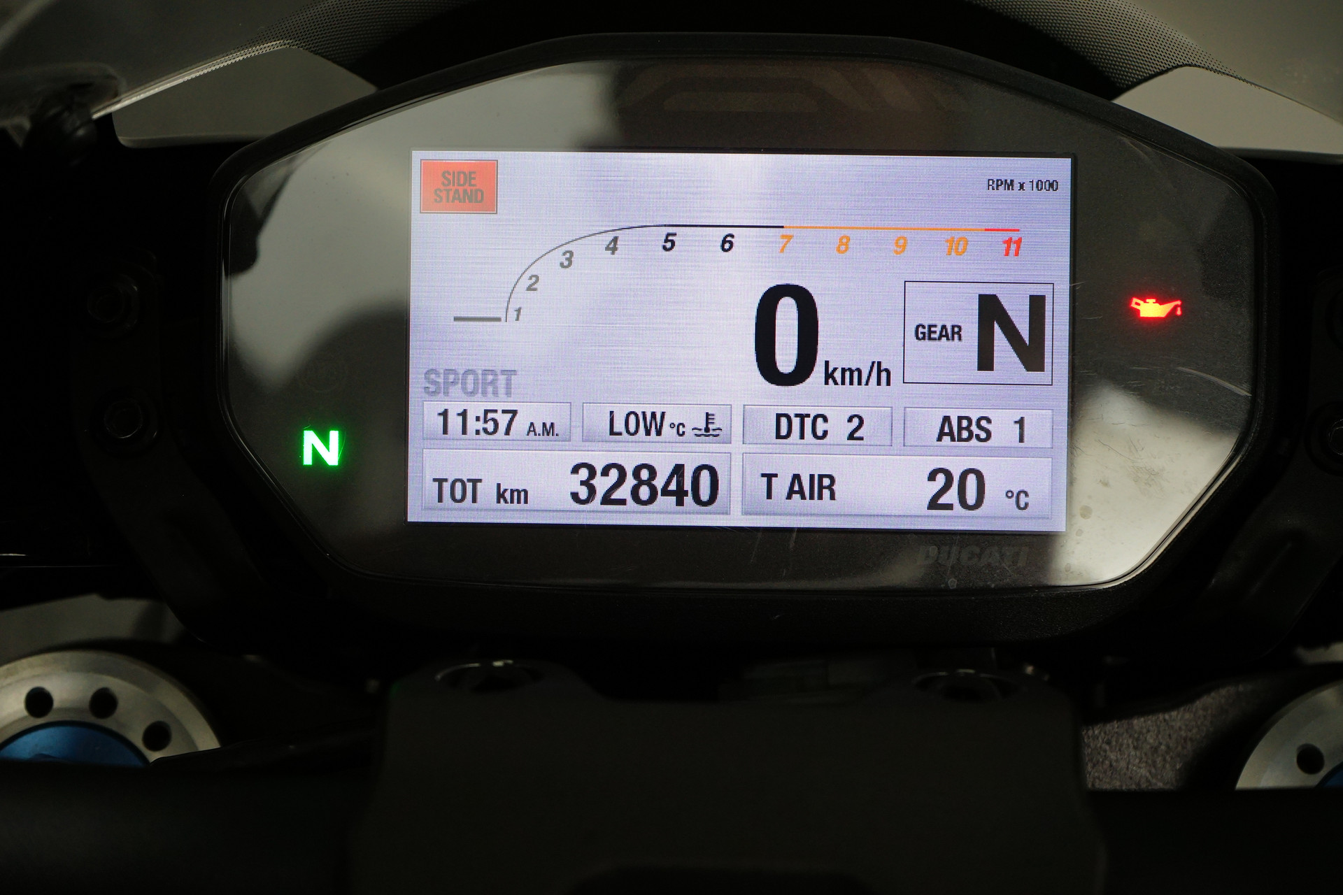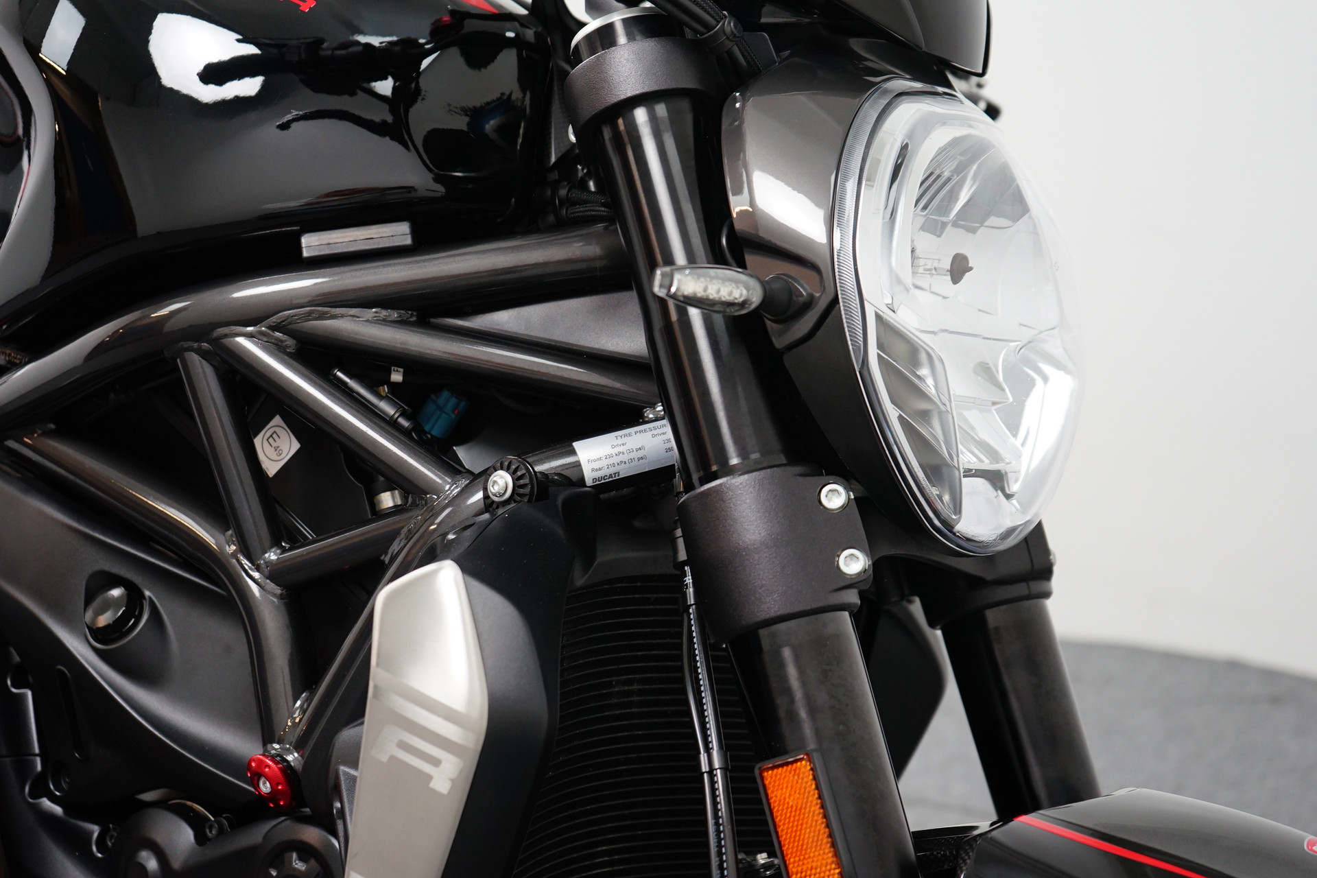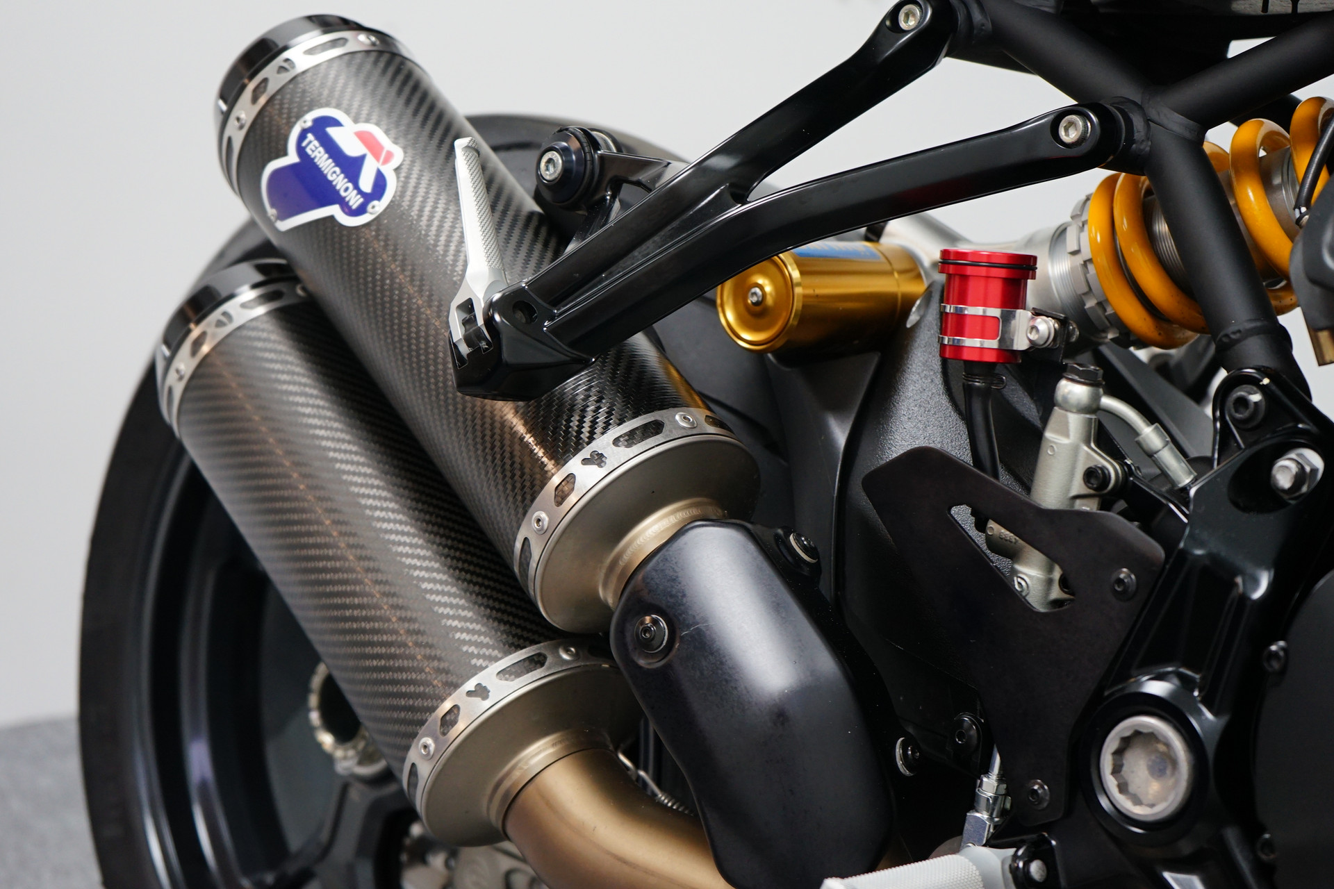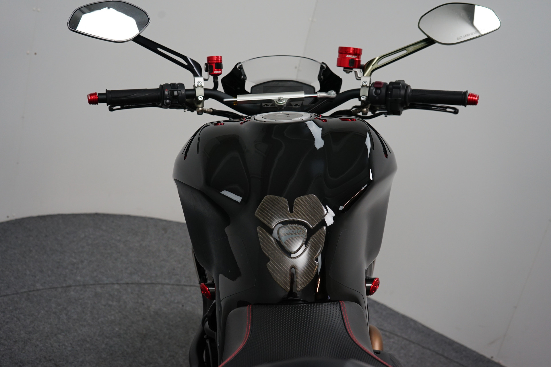Een in prachtstaat verkerende Ducati Monster 1200 R met Termignoni uitlaatsysteem, Seat Cover, Tankpad, Korte kentekenplaathouder, Led knipperlichten en Stuurdemper.