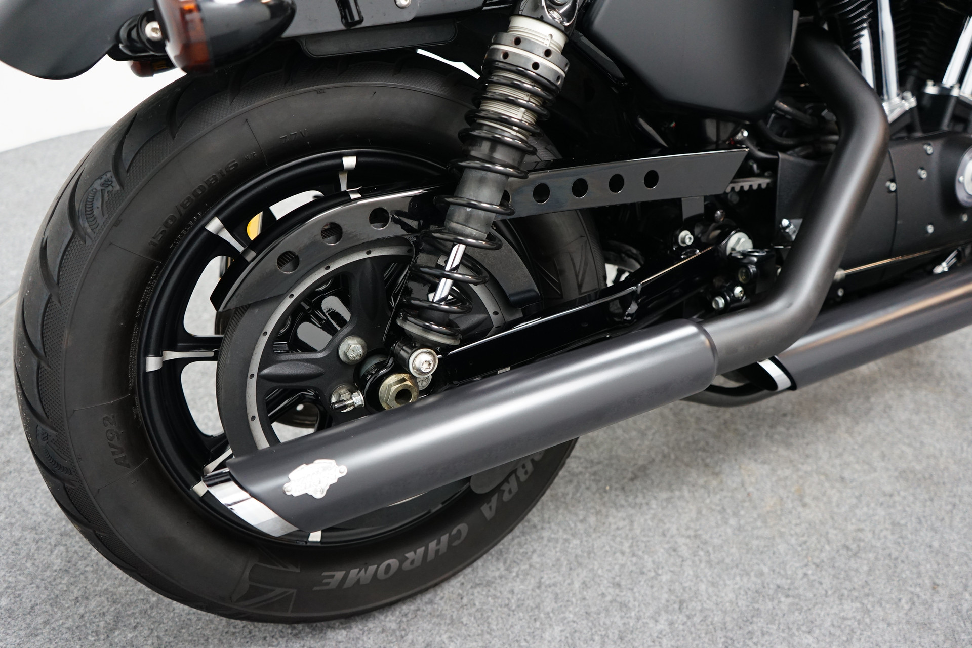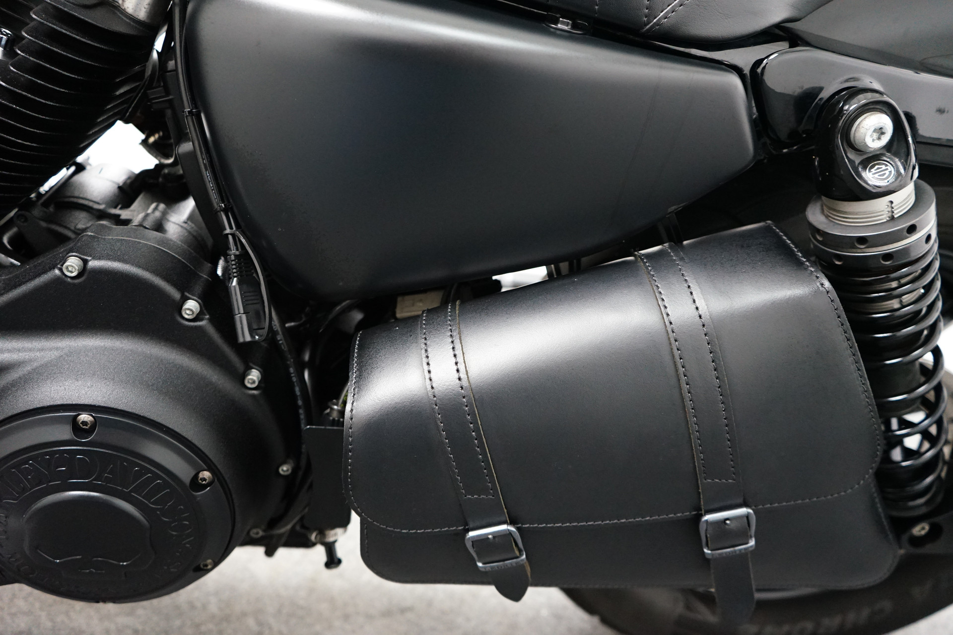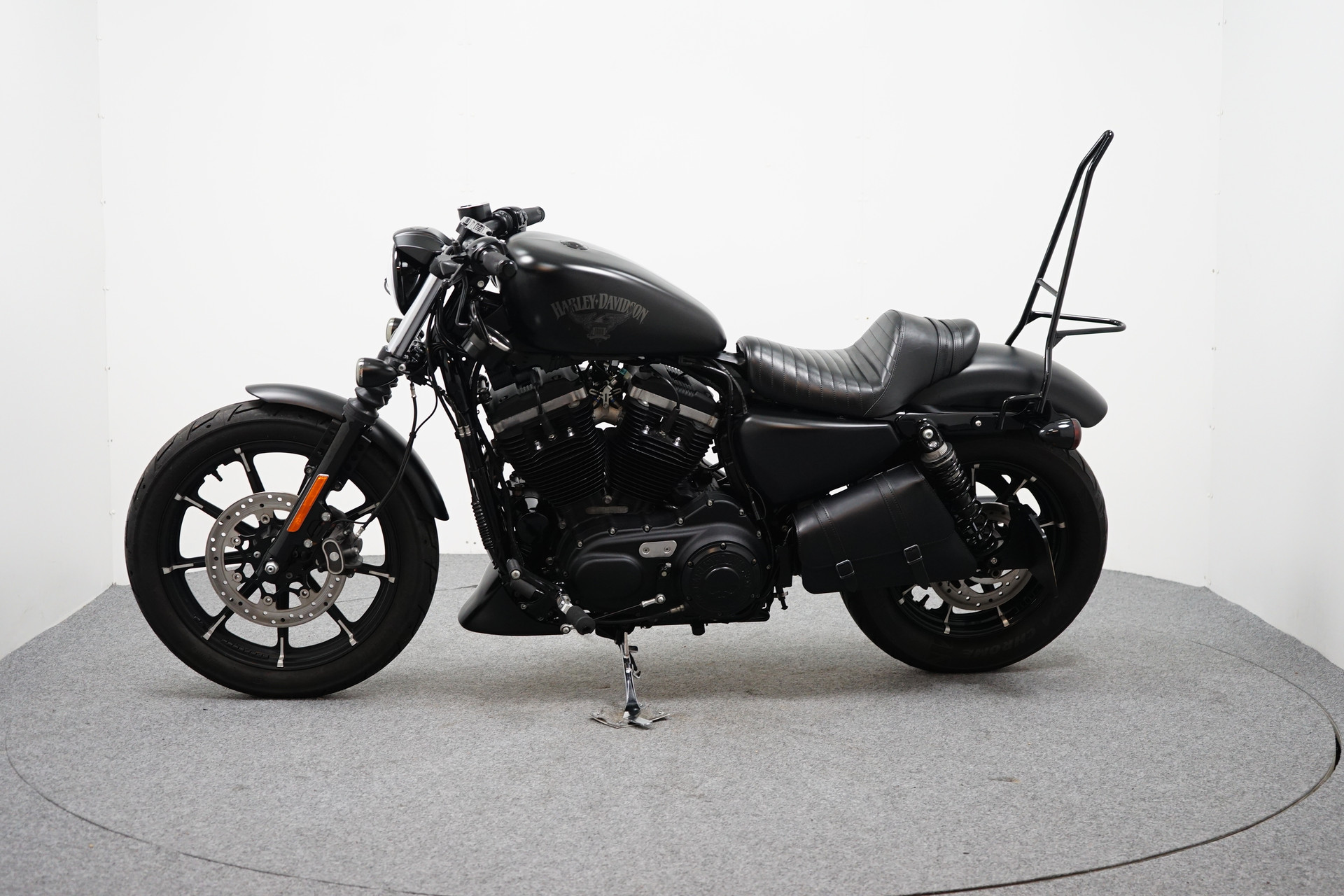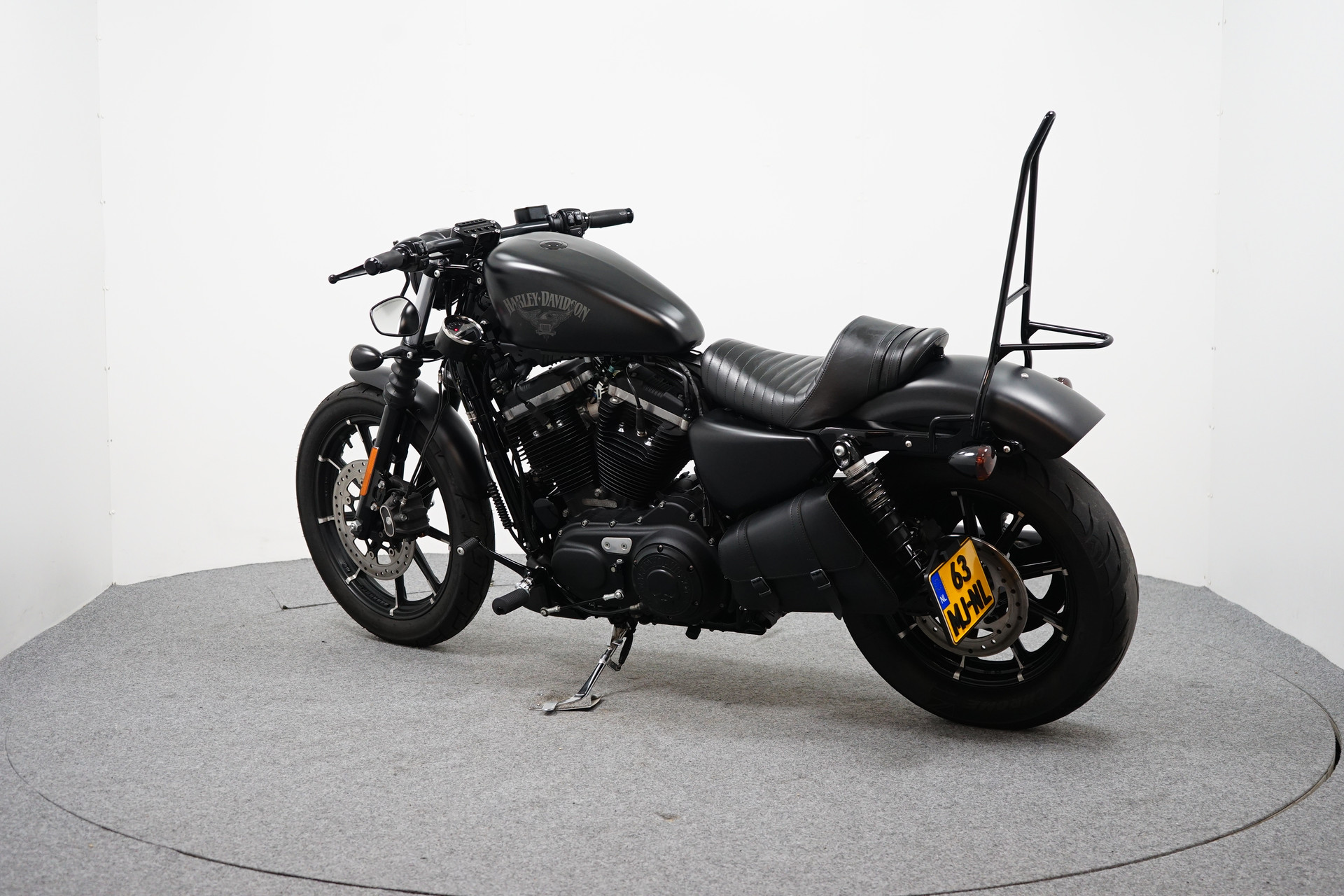 Een in zeer mooie staat verkerende Harley-Davidson Sportster XL883N Iron met een verbreed stuur, Vance&Hines sportuilaten ( LETOP: zonder E-keurmerk ), Le Pera zadel, Teller montage aan zijkant en aan de zijkant gemonteerde kentekenplaathouder.