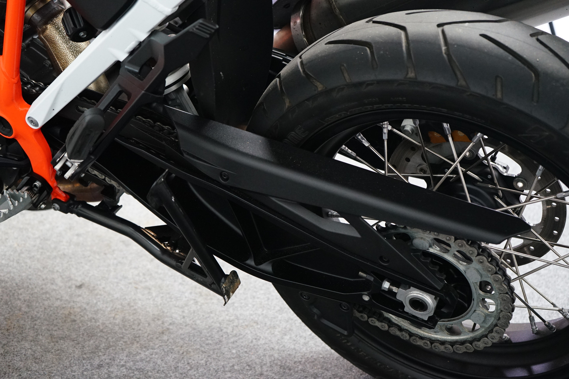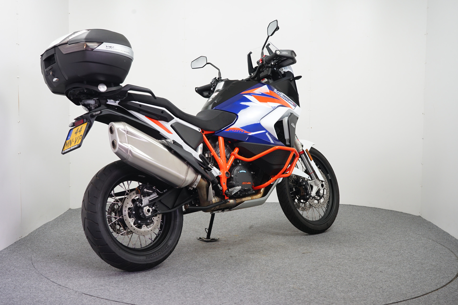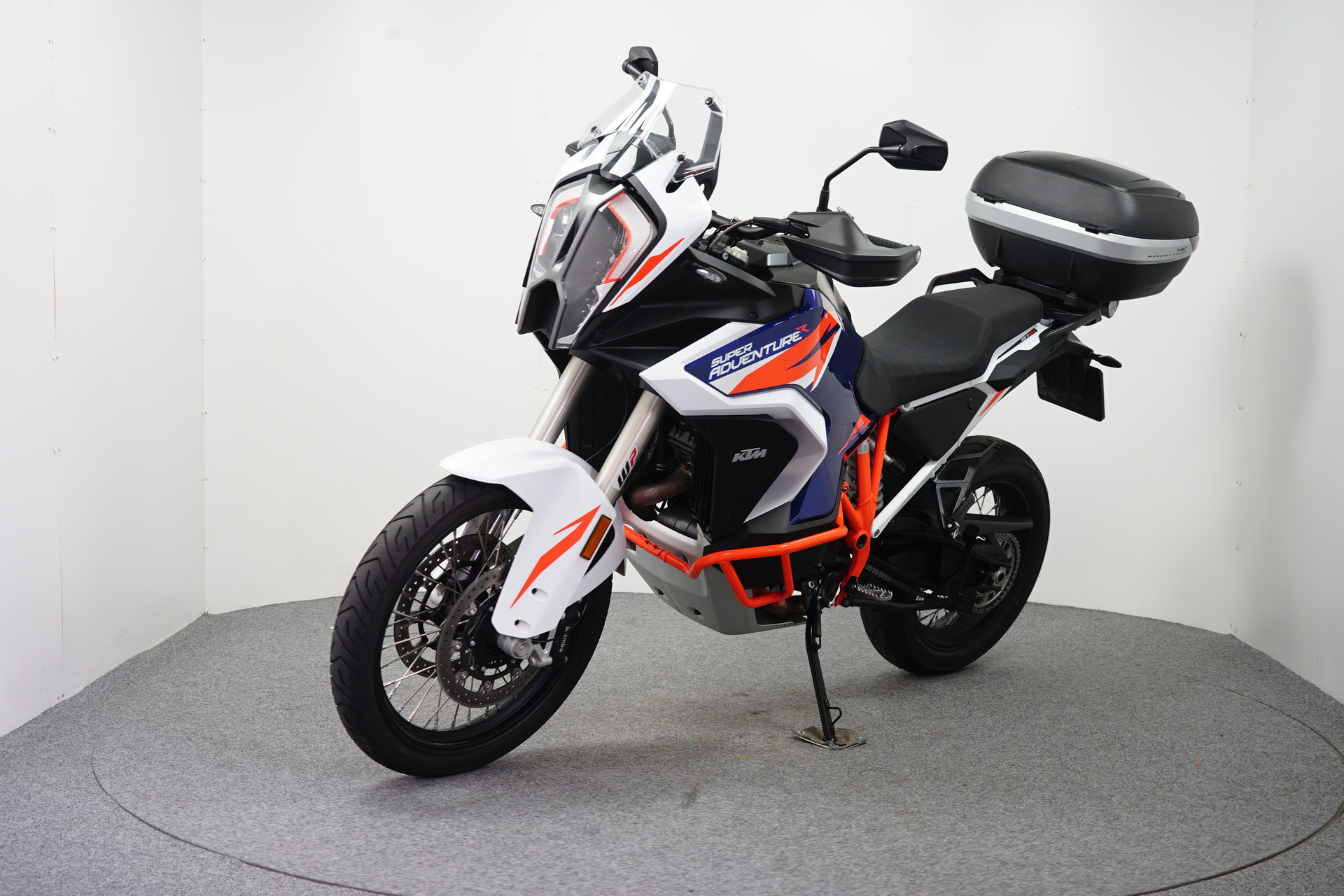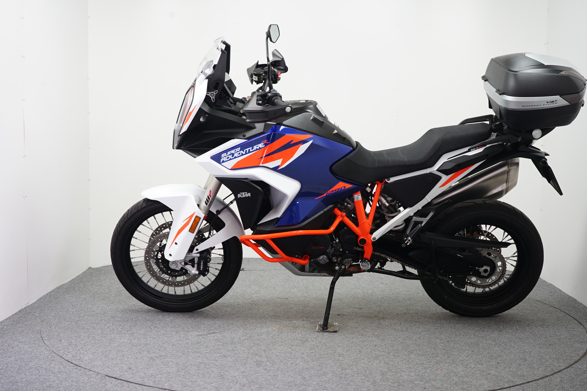 Een in nieuwstaat verkerende KTM 1290 SUPER ADVENTURE R ABS van de 1e eigenaar met Topkoffer, Keyless Ride, Instelbare rij-modi, Bandenspanning controle, WP vering, Handkappen, Valbeugels en een Middenbok.