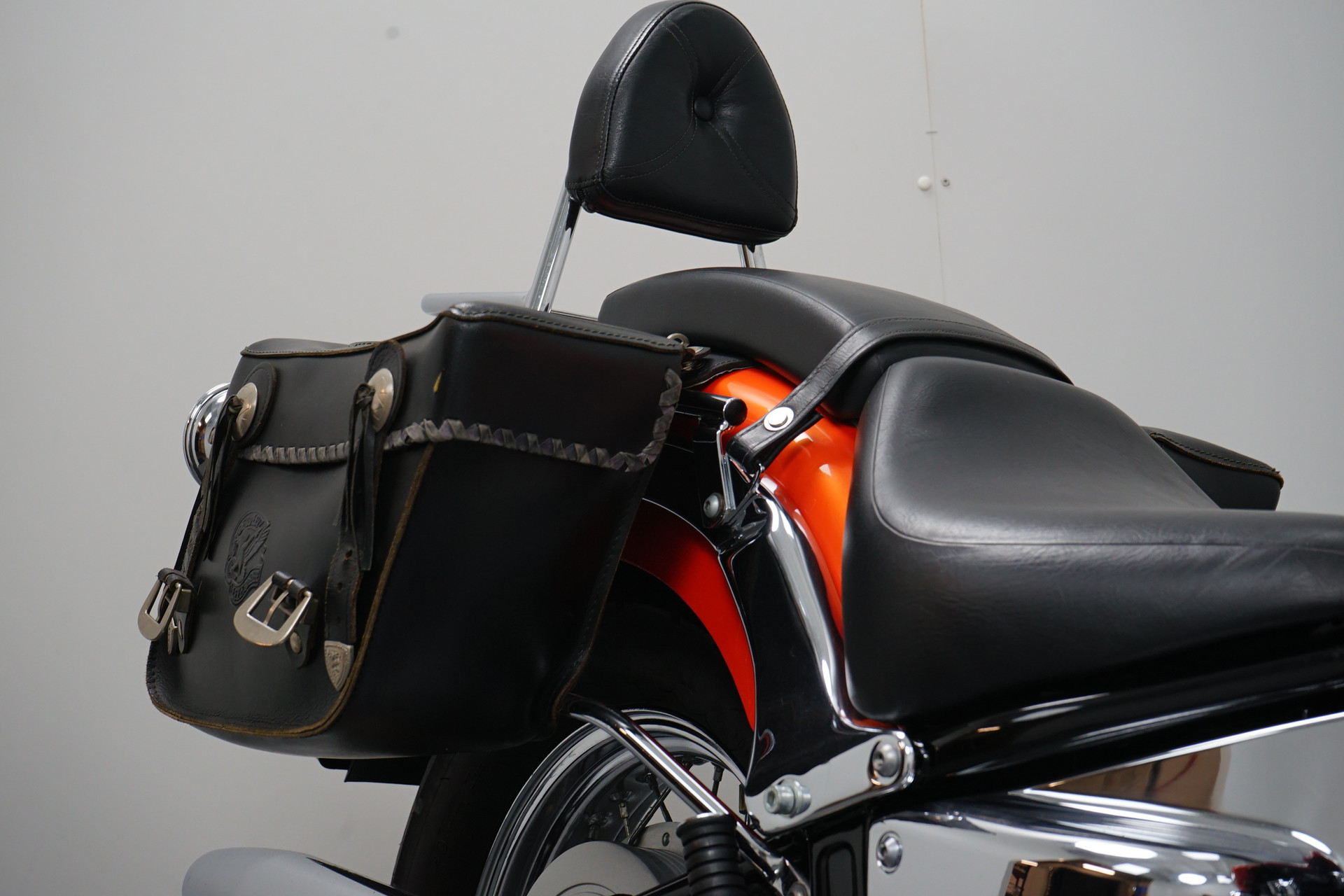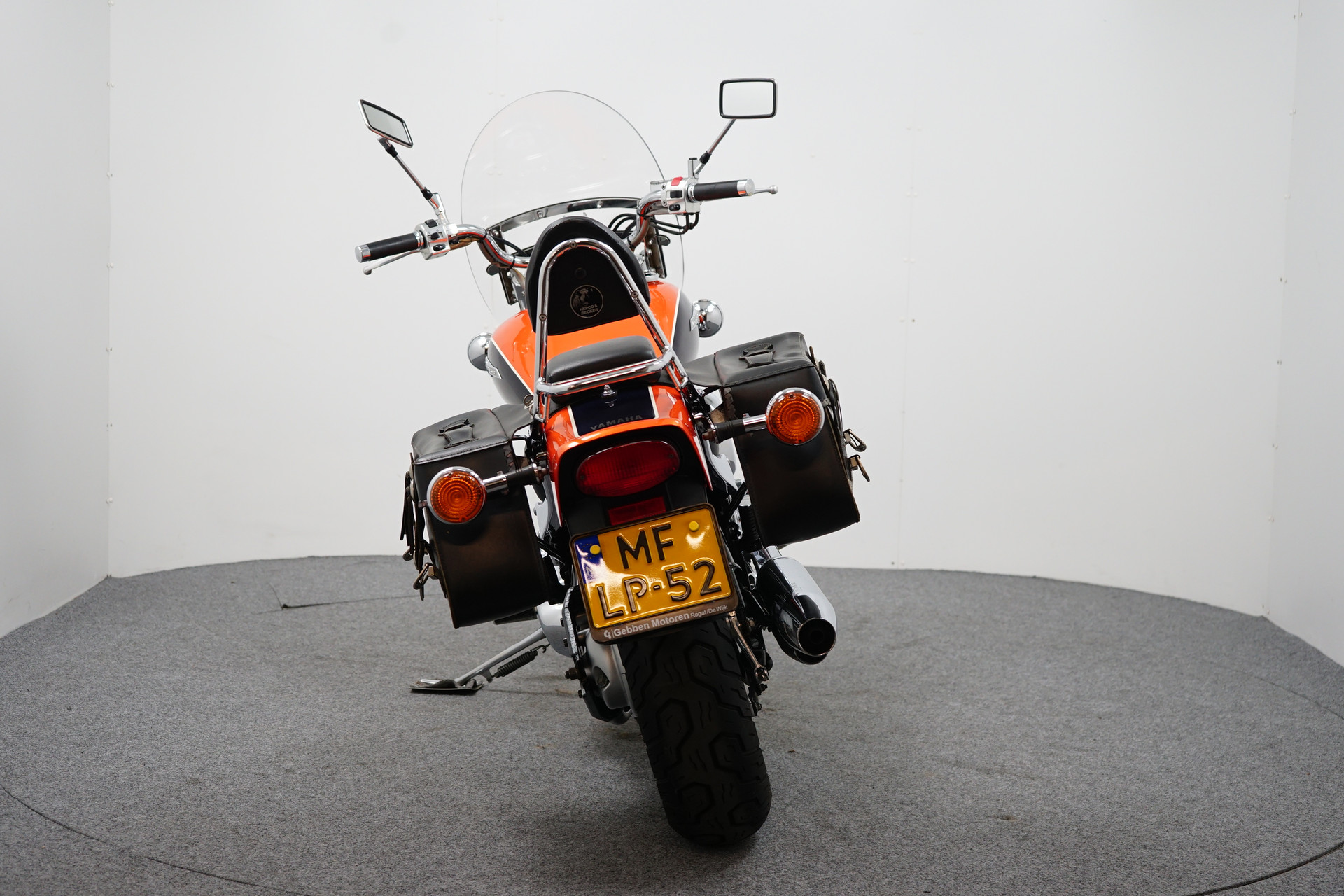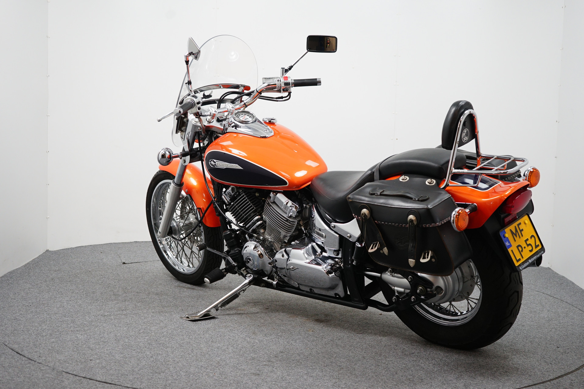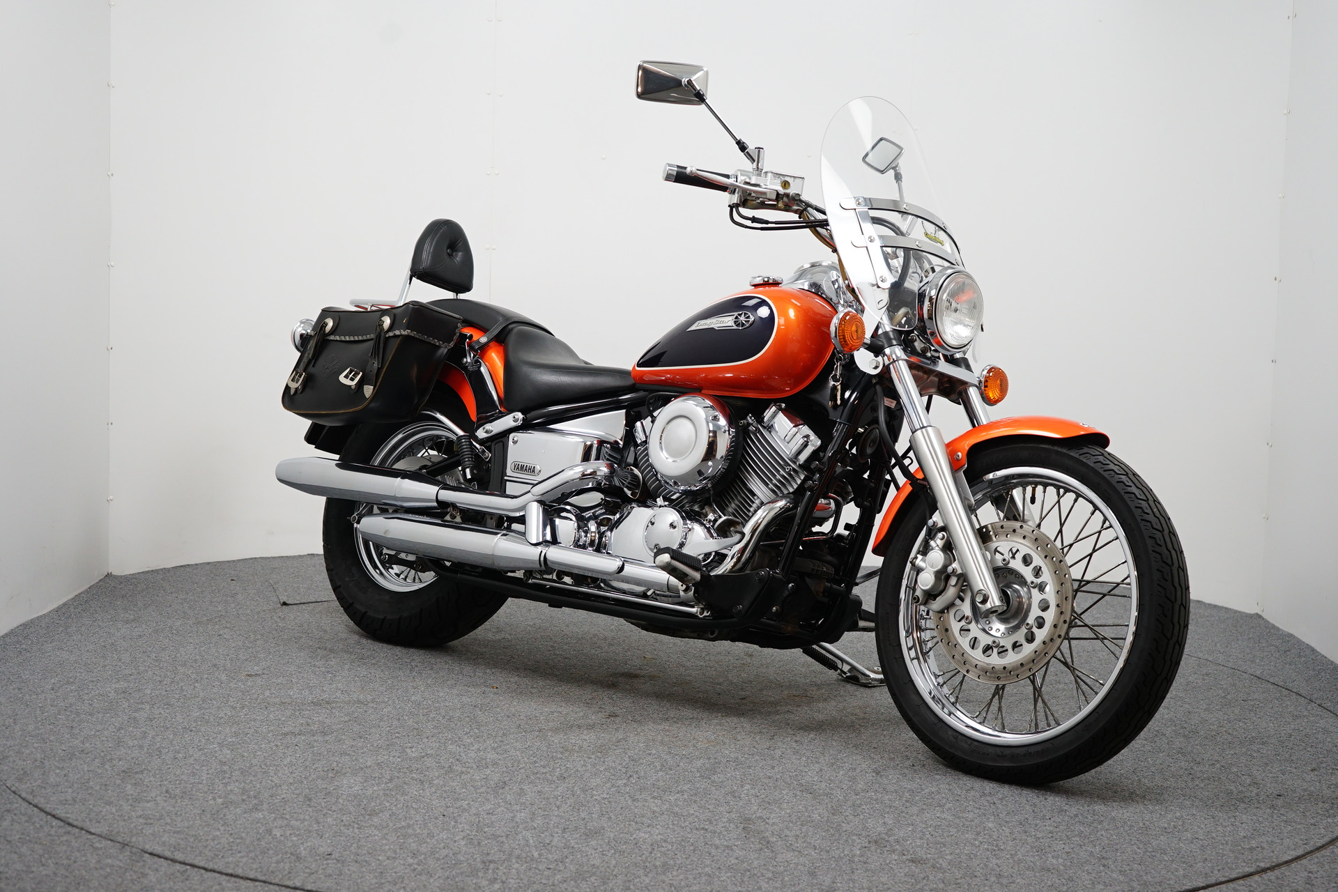 Een in zeer nette staat verkerende Yamaha Dragstar 650 Classic met een leren tassenset, Custom Wings windscherm en een Hepco&Becker Sissy-Bar.