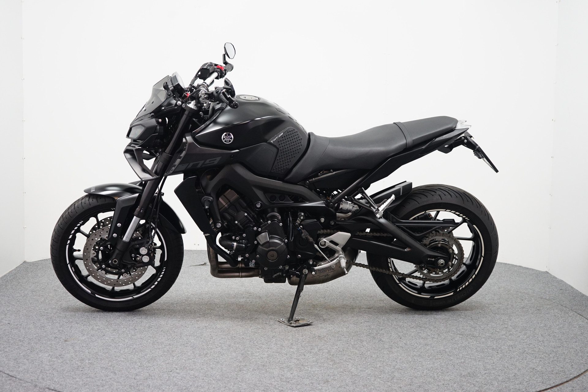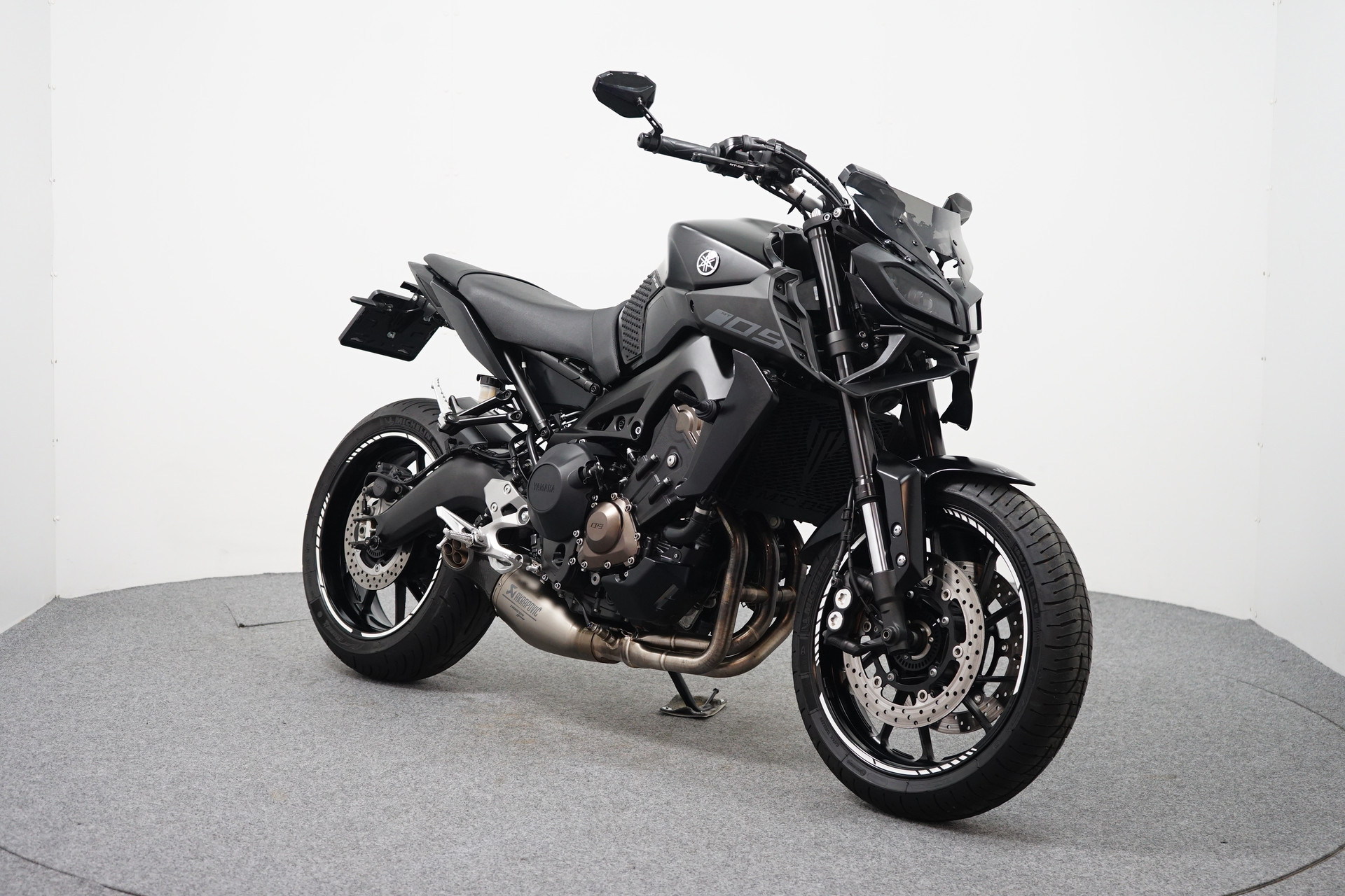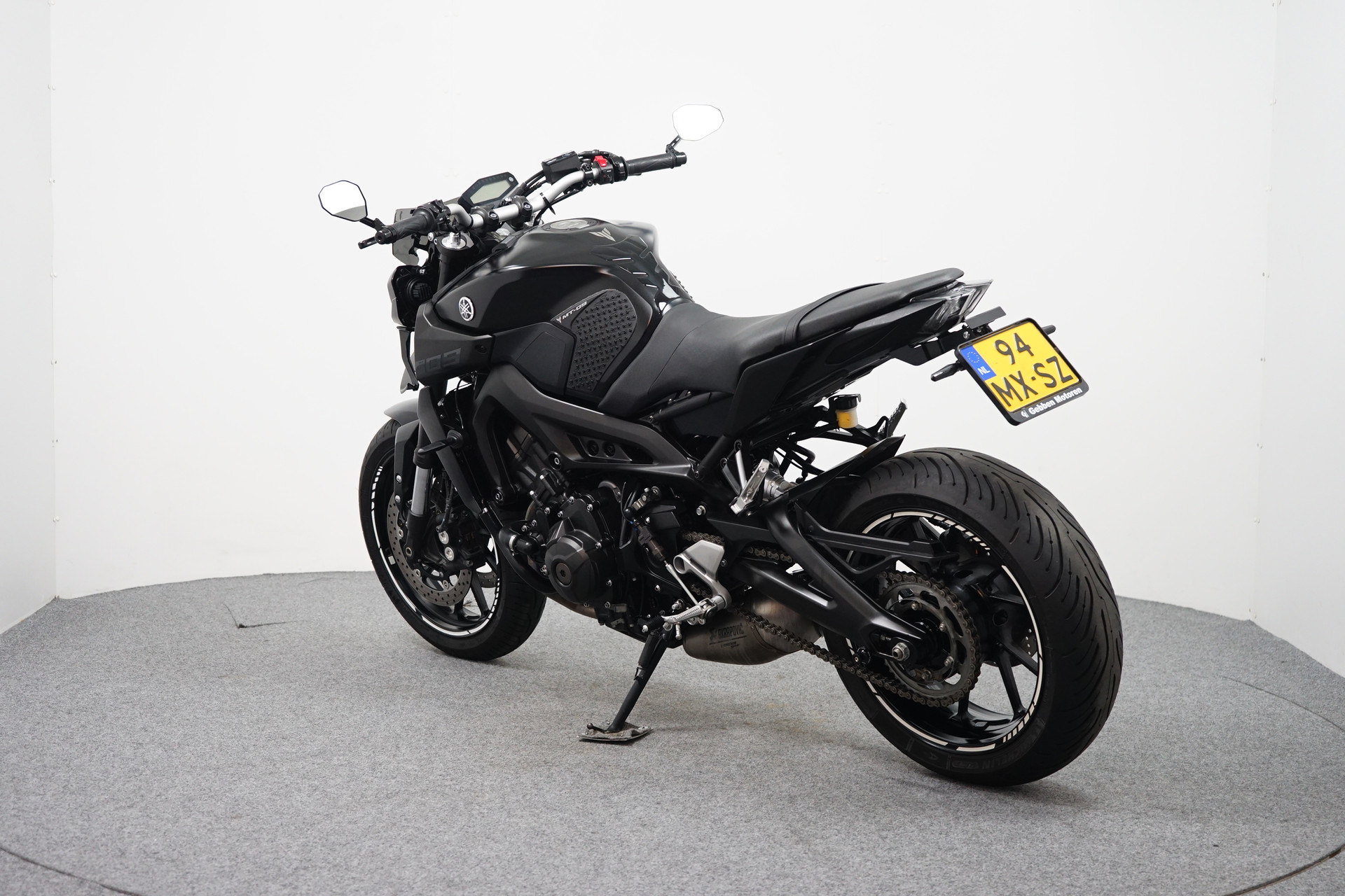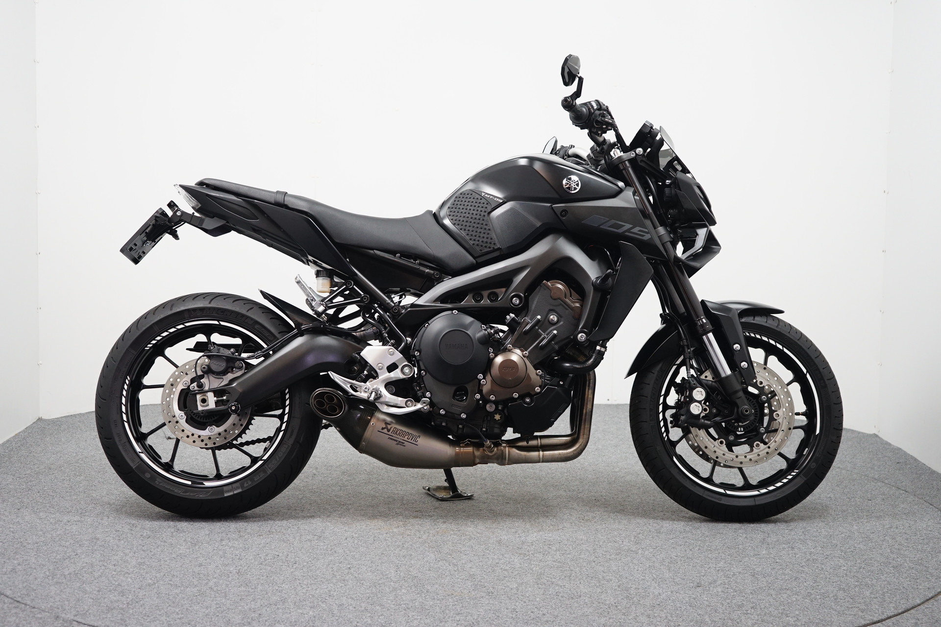 Een in zeer mooie staat verkerende Yamaha MT-09 ABS met Akrapovic uitlaatsysteem, Bar-end spiegels, Handvatverwarming, Quickshifter en een Korte kentekenplaathouder.