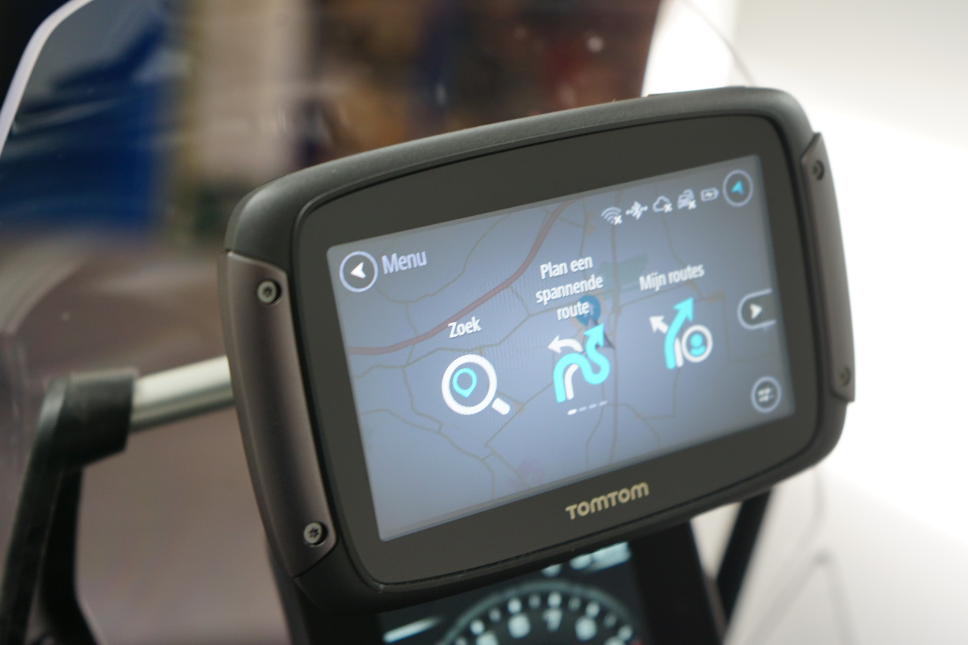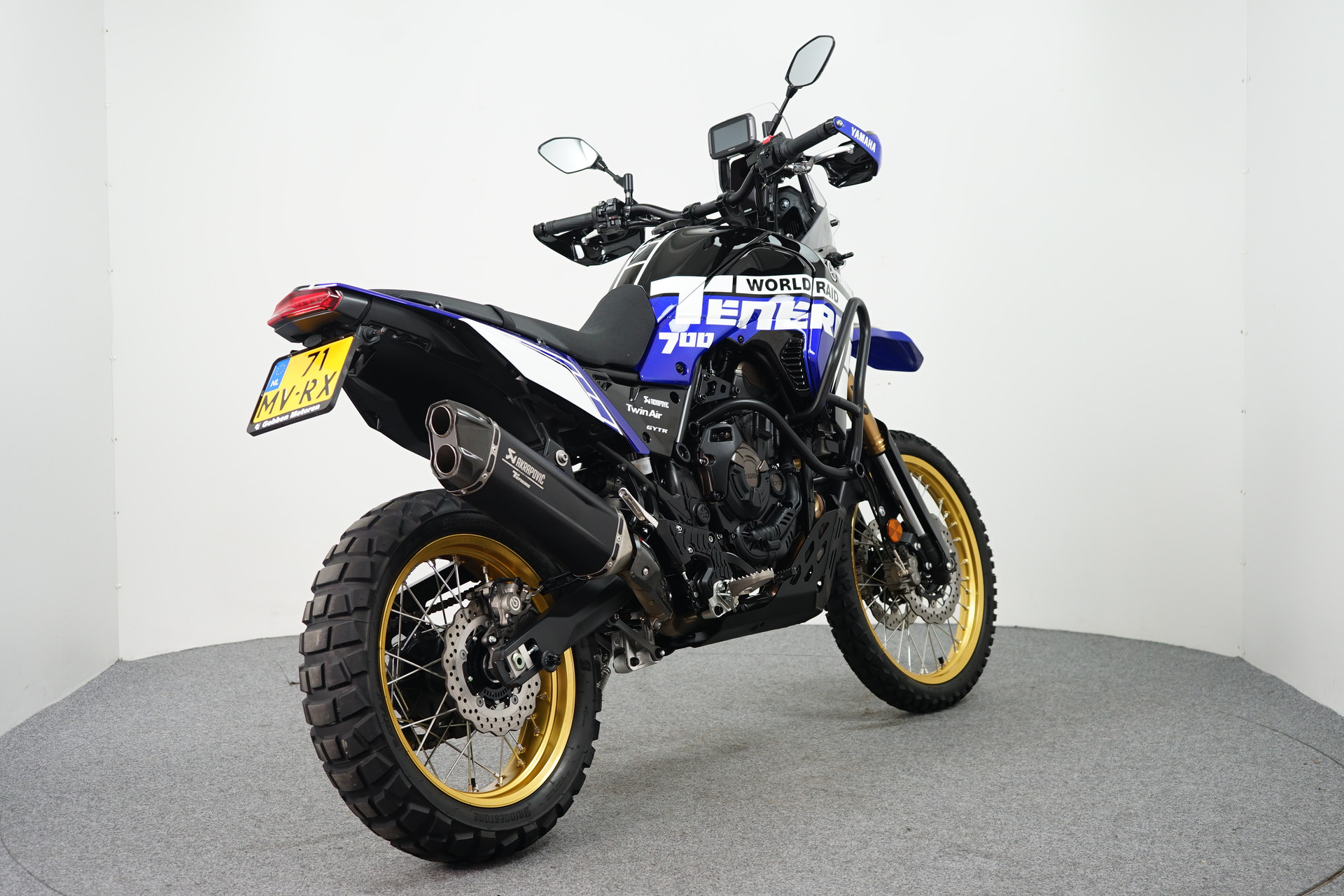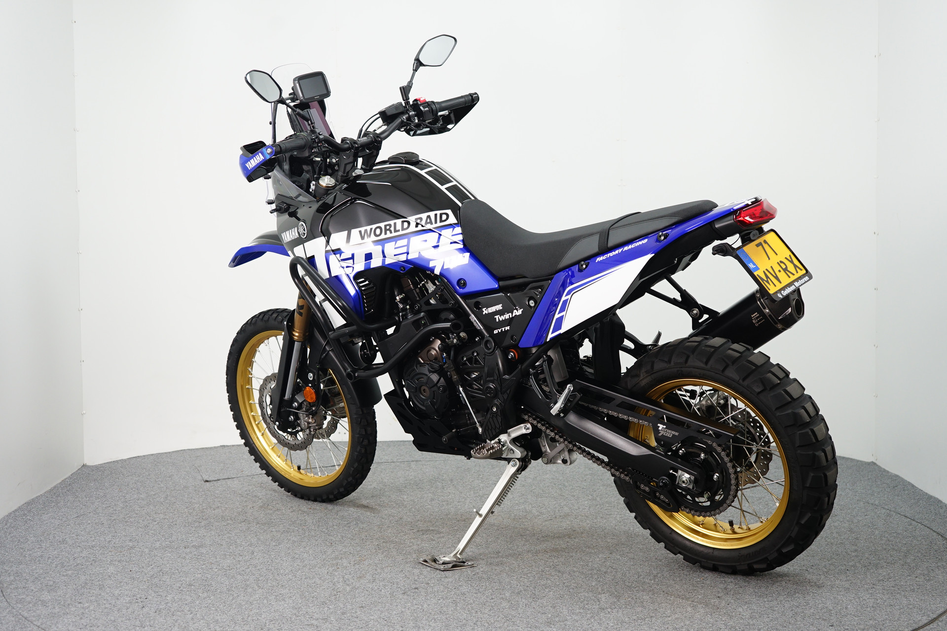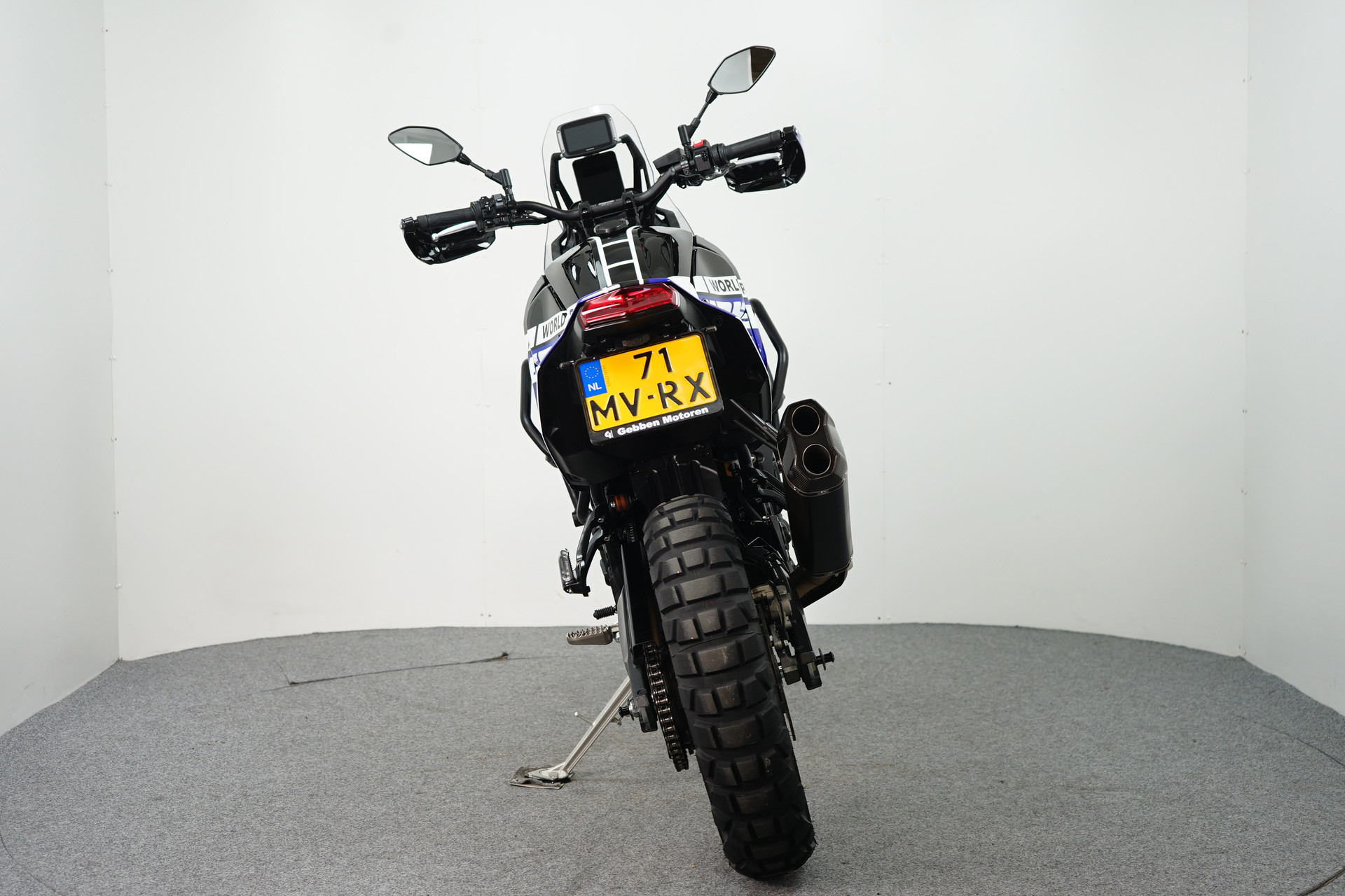 TomTom rider 550SE, Korte kentekenplaathouder, Kayaba vering, Twin air luchtfilter, Handvatverwarming, Quickshifter, Renthal fatbar zwart stuur, zwarte remleidingen, zwarte skidplate, zijstandaard verbreder, koplampbeschermer, radiateurbeschermer, valbeugels en Akrapovic uitlaat.
